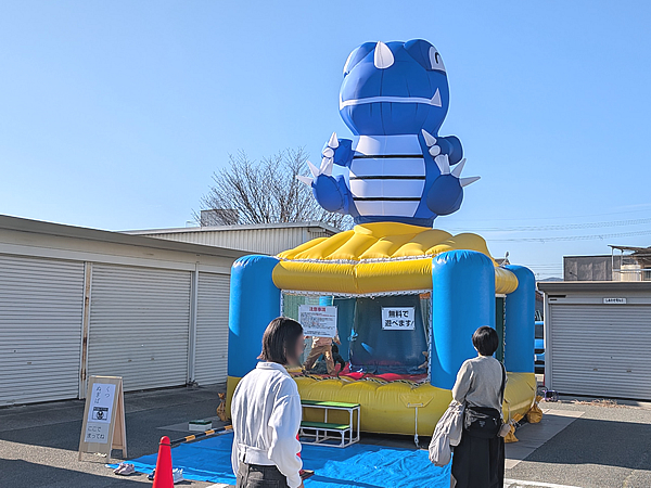 ご予算や設置スペースの兼ね合いから上部の青い恐竜のキャラクターがインパクト抜群のエアランドミニが選ばれました。小規模、中規模のイベントで只今、一番レンタルされているおり、小学校に上がる前の未就学児のお子様なら10名ほどが同時に遊ぶことができるふわふわです。これまでにこのエアランドミニをご使用された方からは「程よい大きさなでイベント会場でもとても目立つ!」「ふわふわの中の様子が見やすく運営がしやすい!」という点が好評いただいております。
