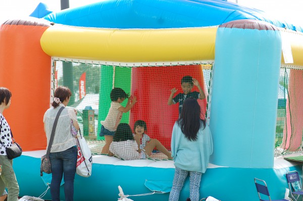 周りやテントやブースが多かったこともあり、ふわふわは芝生広場の中でも一番大きく、高く目立っていました。遠目からでもピンクザウルスの姿を見ることができたので、会場外からでも「イベントを開催している」というのもアピールできたのではないかと思います。