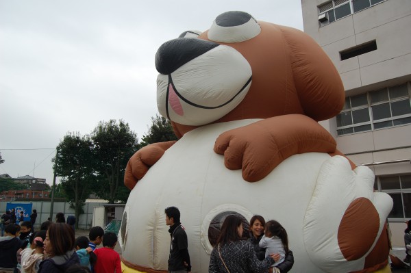 午前9時から秋祭りスタート予定。トータルパックご利用でしたので、8時前にはスタッフは到着してふわふわを膨らませました。開始前でしたが、児童の姿もあり、徐々に大きくなる犬のふわふわは俄然、興味、関心を集めていました。 そしていよいよ秋祭りの開始時間の午前9時を迎えると同時に、たくさんの子ども達がふわふわに押し寄せ、あっという間に行列になってしまいました。これにはPTAの側も予想以上だったようで、打ち合わせの結果、たくさんの児童に遊んでもらえるよう1組5分ずつ(出入りを含めて)に設定して順番に遊んでいただきました。このルールをどの児童もきちんと守ってくださり、円滑に運営することができました。普段は体感できないふわふわ特有の無重力感に児童達は楽しそう、嬉しそうな笑顔を浮かべていました。中には何度も遊びに来てくれる児童もいました。 結果、行列は最後まで途絶えることはなく秋祭りは終了。撤収中も「もう終わりなの?」と言わんばかりのとても名残惜しそうにしてくれていた児童達の表情が印象的でした。