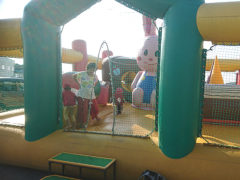 大型のふわふわということでオープンランドシリーズの一つ「森のゆうえんち」をレンタルいただきました。うさぎやカブトムシなど森に住む動物達のモニュメントが各所に取り付けられたふわふわで、中規模~大規模イベントで活躍しています。サイズは7.2m×7.2m×4mほどで、同時に20名ほどのお子様が遊ぶことができます。