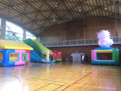 この日は雲行きが怪しかったため、ふわふわの設置場所を小学校グラウンドから体育館へと変更しましたが、天井の高さも十分にあったため、弊社随一の大きさであるビッグスライダーも問題なく設置することができました。