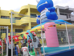 先日はありがとうございました。 設置も撤収もおひとりで作業をしていただき、本当に助かりました! 当日はあいにくのお天気で野外イベントが中止となってしまい残念でしたが、 その分、ふわふわエアランドを館内で開催できたことは本当に良かったと思っています。 諦めていたキャラクターの部分も天井までちょうどふくらませることができて感動しました! 結果、式典のため休止した時間を除く3時間半ほどの間に127名の子供たちに体験してもらうことができました。 晴れた日の芝生広場で開催できれば、もっとたくさんの子供たちに楽しんでいただけたことでしょう。 また機会があればご依頼させていただくこともあるかと存じます。 その時はどうぞよろしくお願い申し上げます。